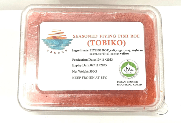 Seasoned flying fish roe. Halal certified.